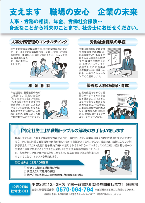 そこで、会社の労働保険(労災保険・雇用保険)・社会保険(健康保険・厚生年金)の面倒な書類手続や、その他の労務管理の書類作成を、私どもに任せることを考えてみられてはいかがでしょうか。